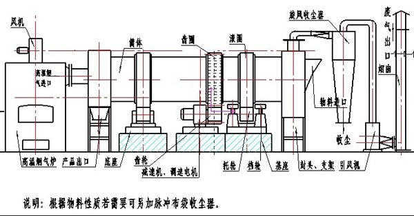 直熱式回轉(zhuǎn)滾筒干燥機(jī)主要由熱源、上料機(jī)、進(jìn)料機(jī)、回轉(zhuǎn)滾筒、出料機(jī)、引風(fēng)機(jī)、卸料器和配電柜構(gòu)成。脫水后的濕物料進(jìn)入干燥機(jī)后,在滾筒內(nèi)均布的抄板的翻動(dòng)下,物料在干燥機(jī)內(nèi)均勻分散與熱空氣充分接觸,加快了干燥傳熱﹑傳質(zhì)。在干燥過程中,物料在帶有傾斜度的抄板和熱氣質(zhì)的作用下,至干燥機(jī)另一段卸料器排出成品。適合于滑石粉的烘干。